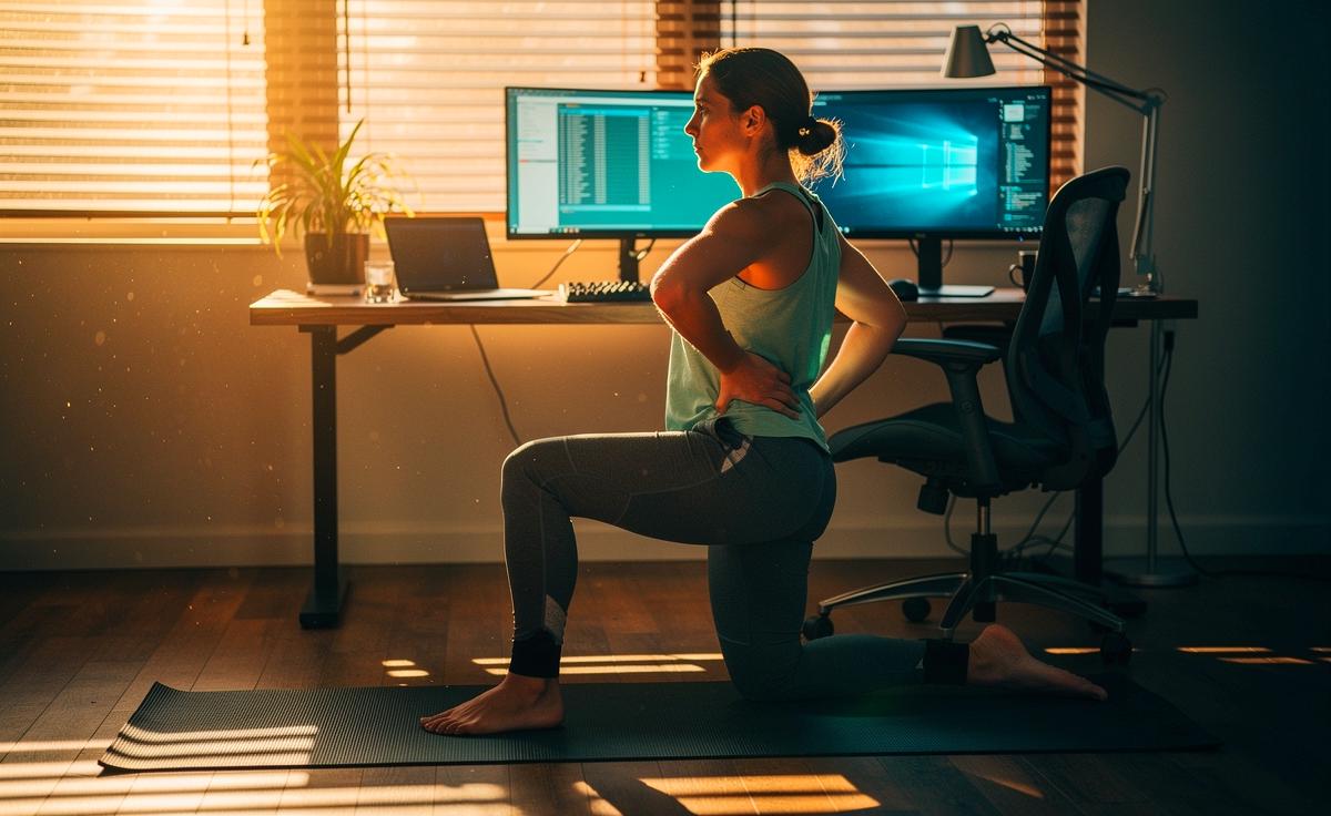 Warum Sitzen Rückenschmerzen begünstigt – und was hilft: die wirksame Hüftbeuger-Dehnung im Halbkniestand, plus ergonomische Tipps und aktive Pausen.
