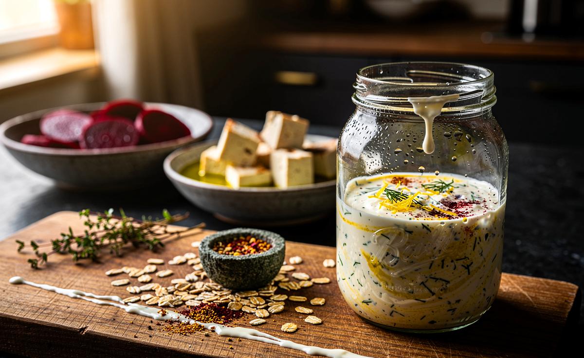 Für eine verlässliche Basis hilft eine Grundformel: 5 Teile Haferflocken-Joghurt, 1 Teil Öl (z. B. Raps oder Olivenöl), 1 Teil Säure (Zitrone, milder Essig), 1–1,2 % Salz, 0,3–0,5 % Gewürzmischung. Lieber nachwürzen, als von Beginn an zu laut. Mit Zeit gewinnt das Ensemble ohnehin an Präsenz. Wer Crunch will, hebt geröstete Nüsse, Körner oder fein geschnittene Kräuter erst kurz vor dem Servieren unter, damit die Textur nicht leidet.