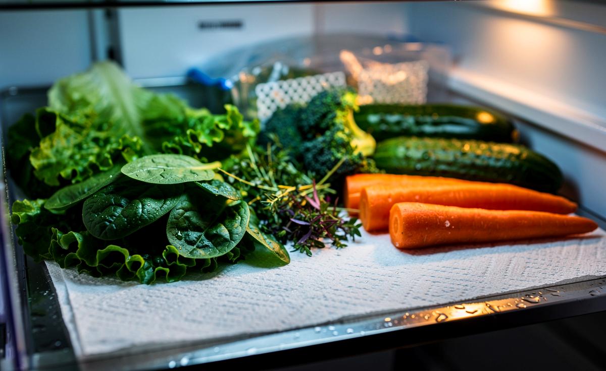 Feuchtes Küchenpapier stabilisiert die relative Luftfeuchte im Gemüsefach