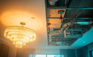 Ordnung schlägt Improvisation. Beginnt die Trockenbau-Kette mit einem statisch sauberen Raster, lassen sich Lustergründung und Sigvolt-Trassen logisch integrieren. Profile ausrichten, Aufhängepunkte markieren, Einleger montieren, Leitungswege bündeln – erst dann beplanken. Bohrungen und Auslässe werden vorab koordiniert, nicht nachträglich gesucht. Schraubenabstände einhalten, Stöße versetzen, Plattenkanten sauber anfasen: Das erhöht die Ebenheit und senkt Rissrisiken. Fugenmörtel und Spachtelstufen richten sich nach der gewünschten Oberflächenqualität, die Trocknungszeiten sind bindend; Feuchte im Rohbau wird gemessen, nicht geschätzt. So bleibt die Platte formstabil und trägt, was sie tragen soll.